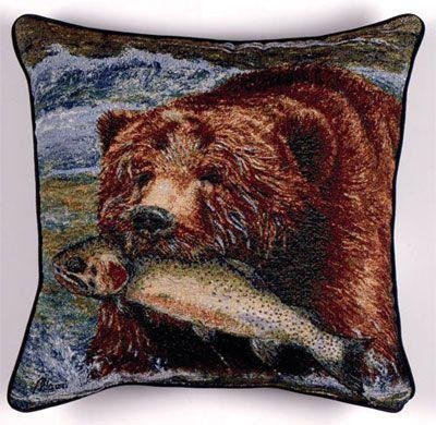 "Joys of Fishing" Bear & Salmon Decorative Accent Throw Pillow 17" x 17"