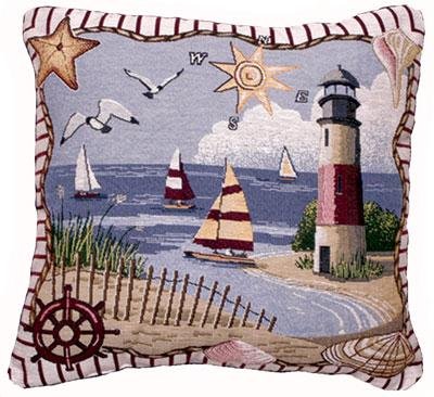 Coastal Memories Decorative Tapestry Toss Pillow. AHOY! This colorful design gives you a taste of the seashore life with images of the sea: sailboats, lighthouse, Seagulls, ocean beach. Front: 60% Cotton/40% Polyester; Back: 70% Polyester/30% Cotton; Filling: Polyester Fiber; Spot or dry clean only. Matching mid-size nautical woven throw available. Made in the USA. Pillow measures 17"x17".List Price: $ 19.99 / $ 29.99